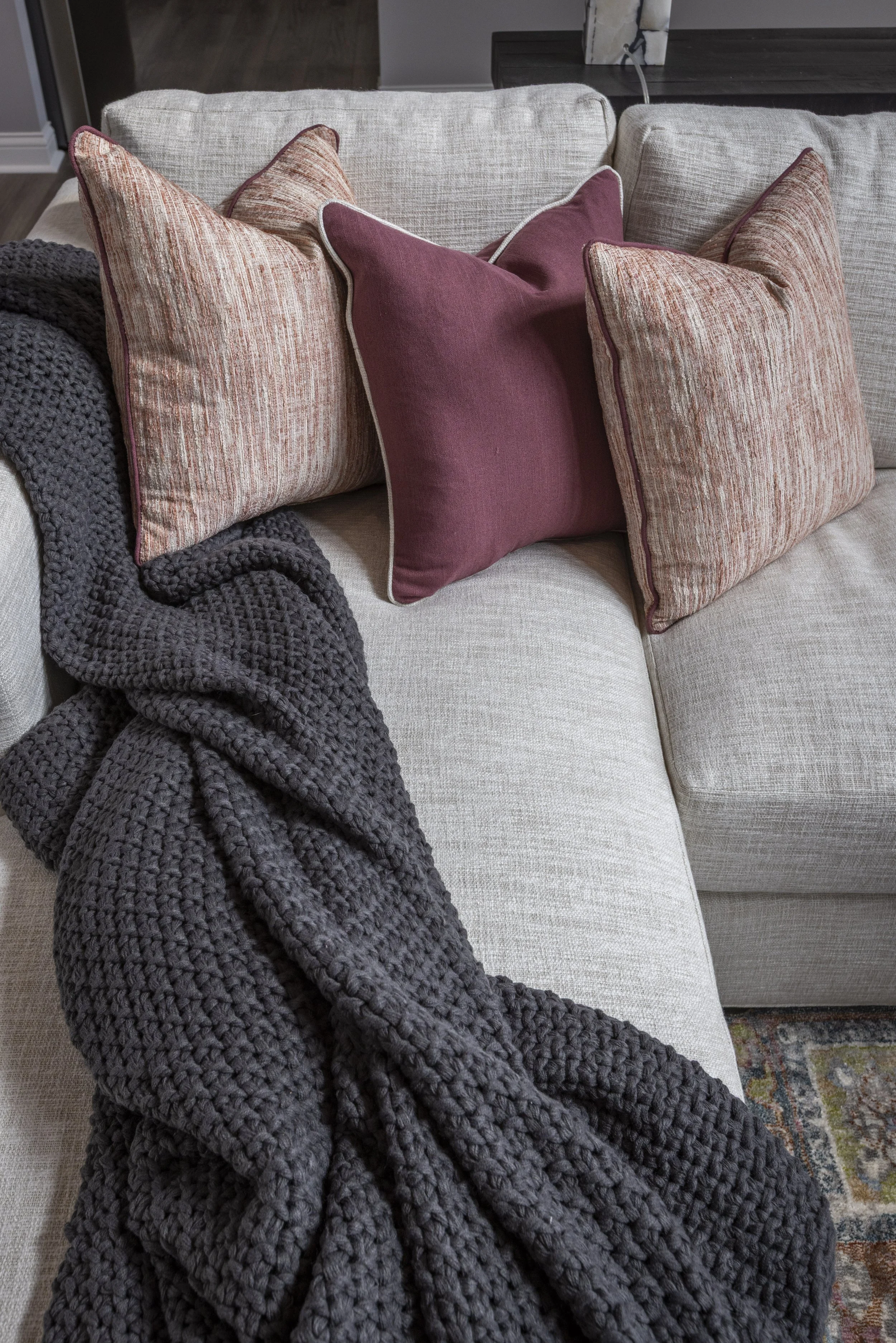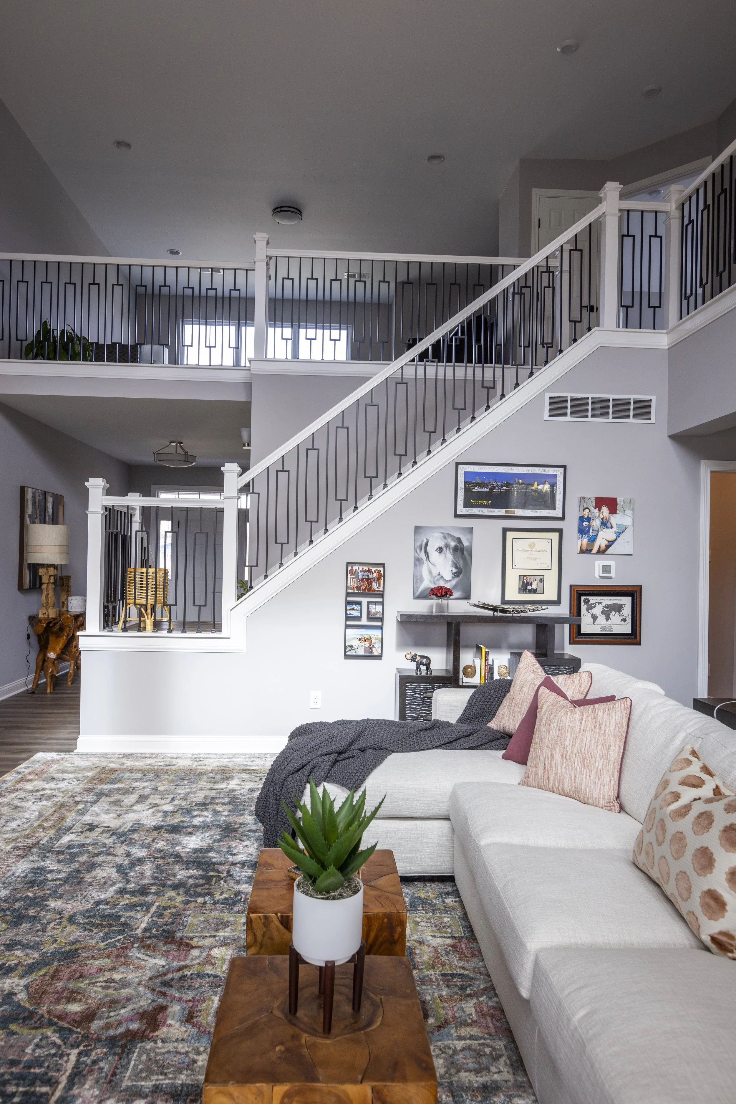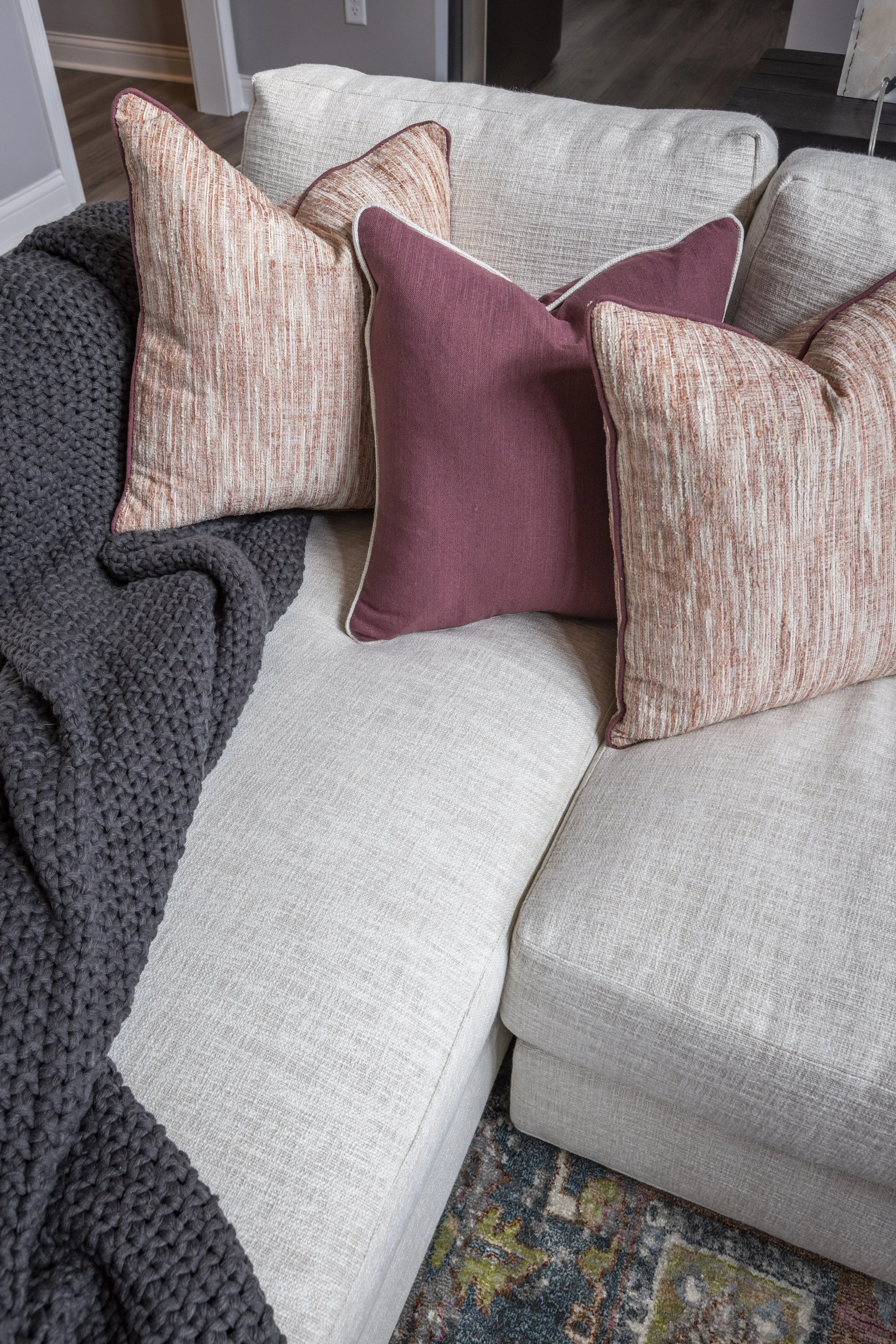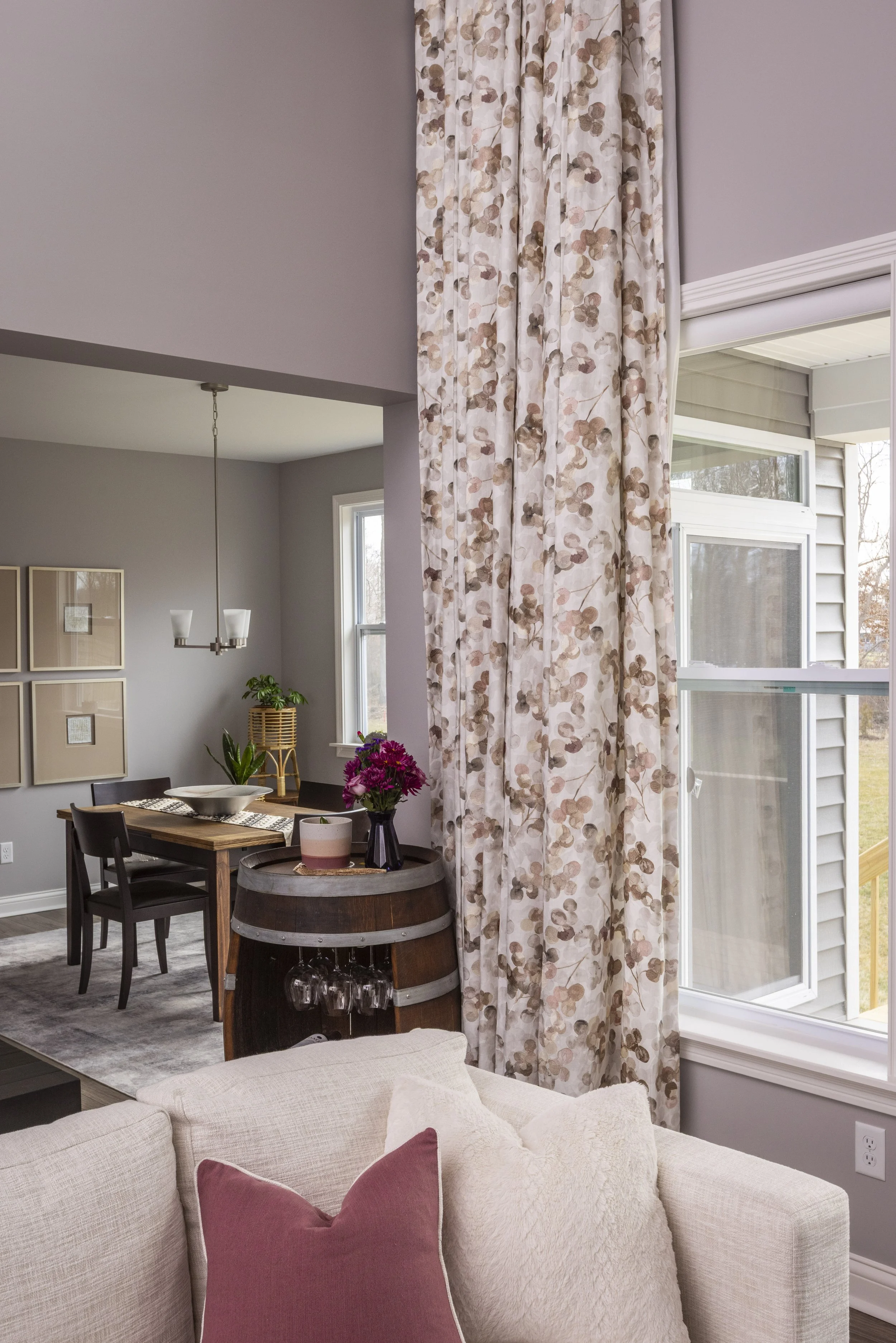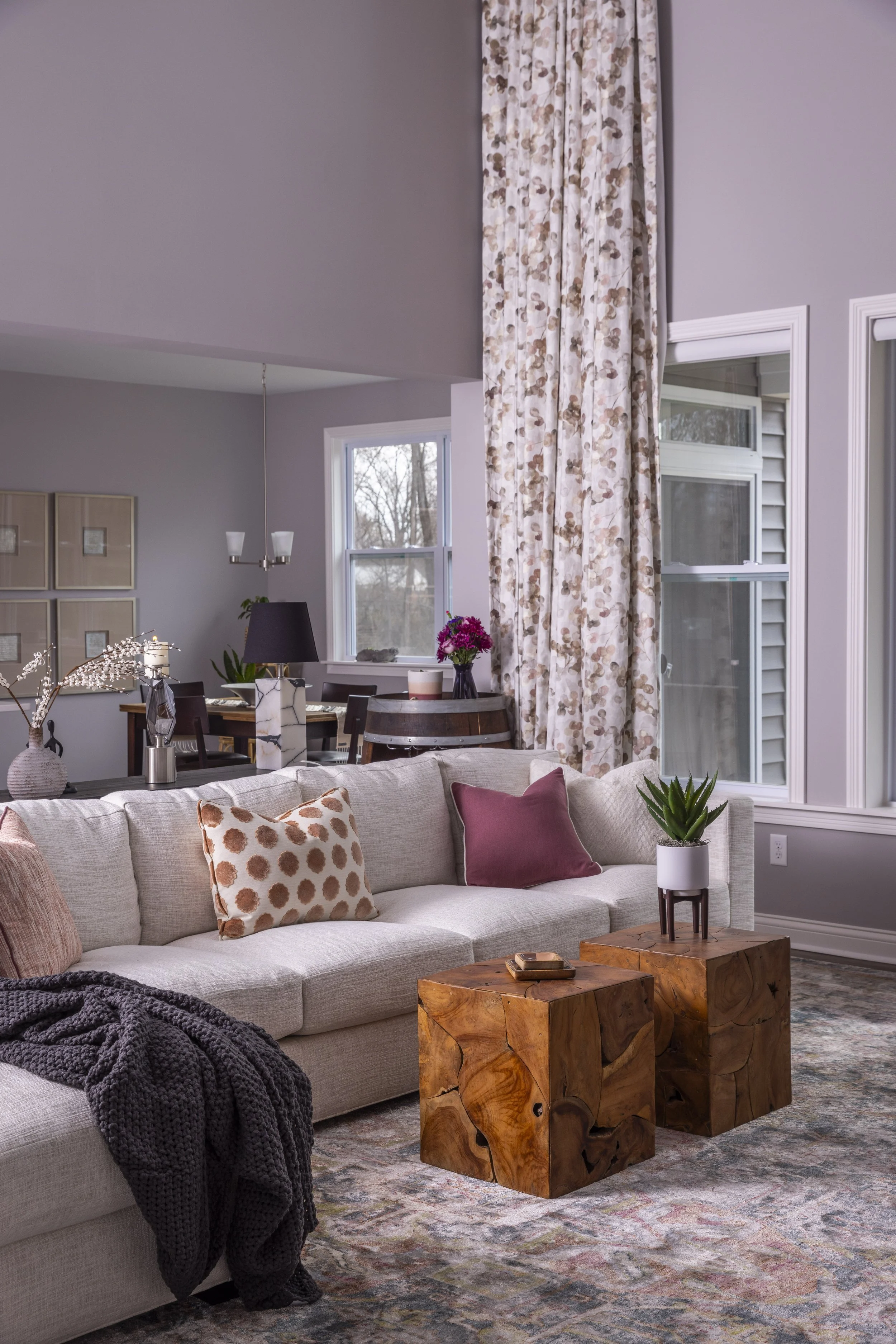 This client just moved to Cincinnati, Ohio from Cambodia for her government job. She wanted color and to be able to mix pieces she has collected over the years at various places she has lived. She loved the color palette that included plum, whites, greys, and browns. The end result was a space she can relax and enjoy after a long day at the office!