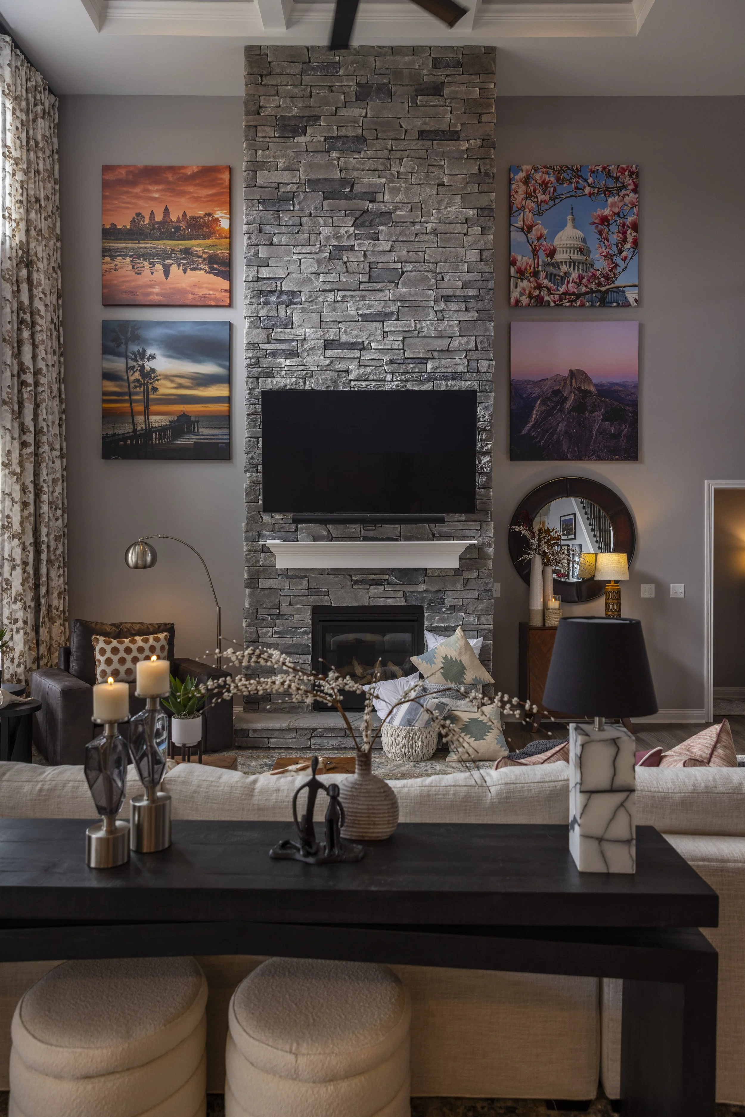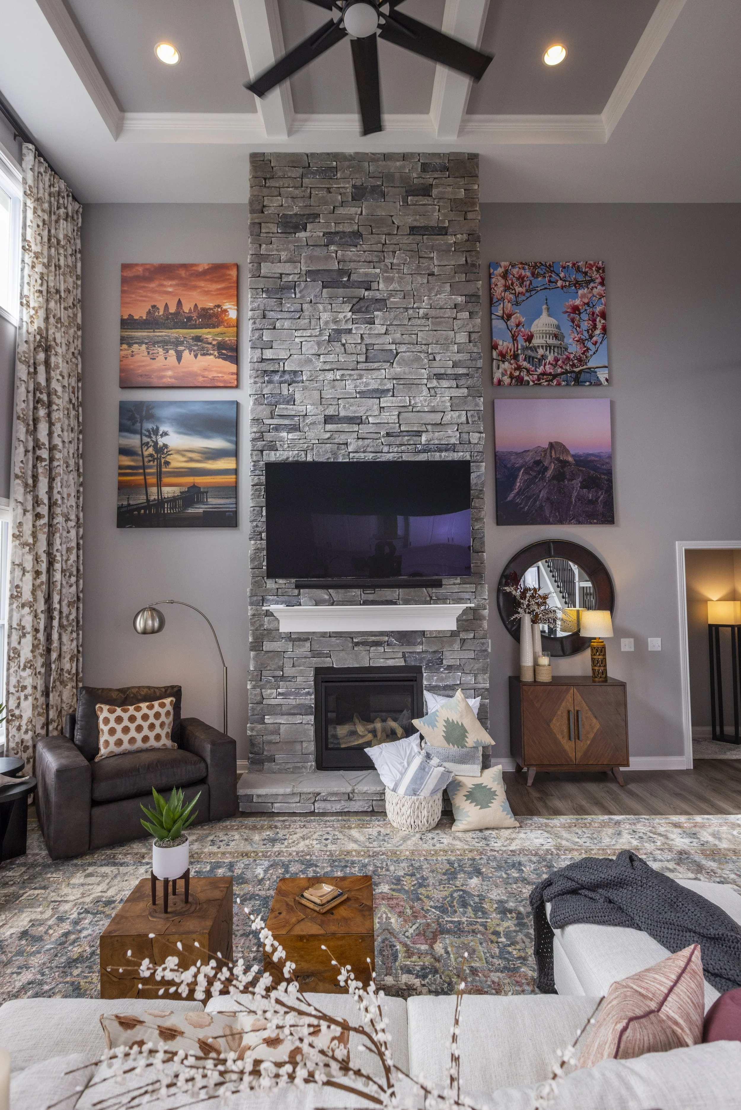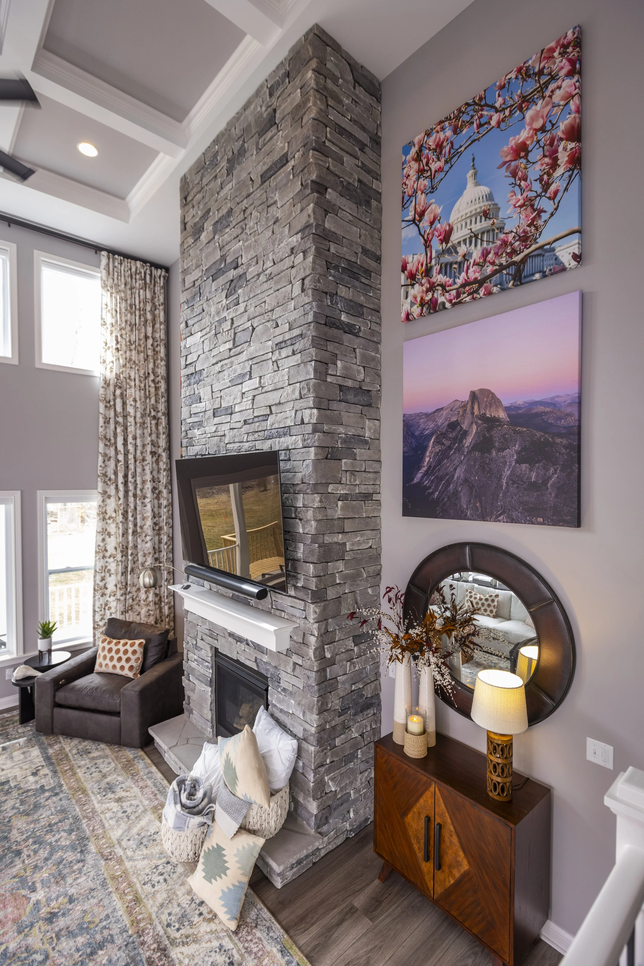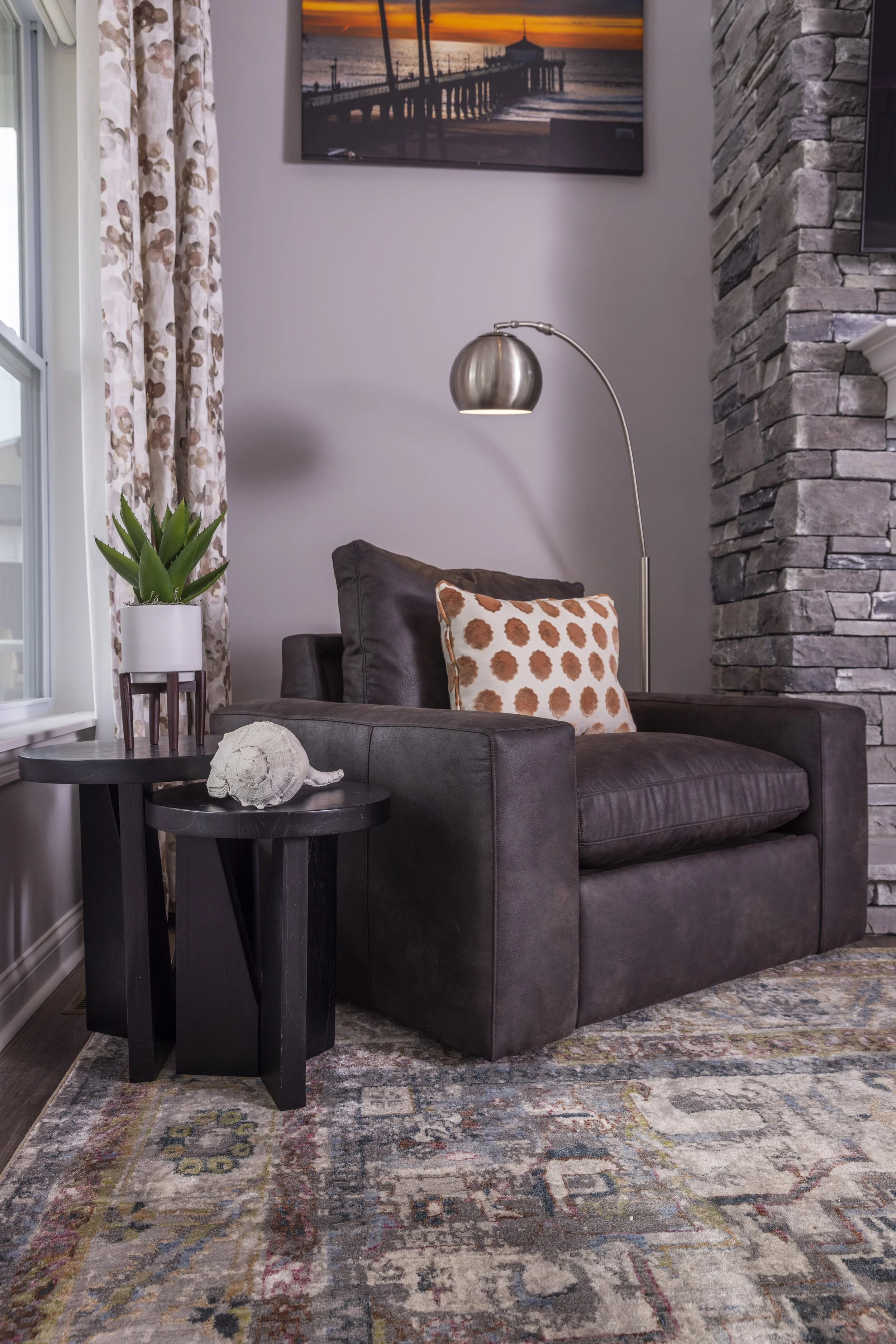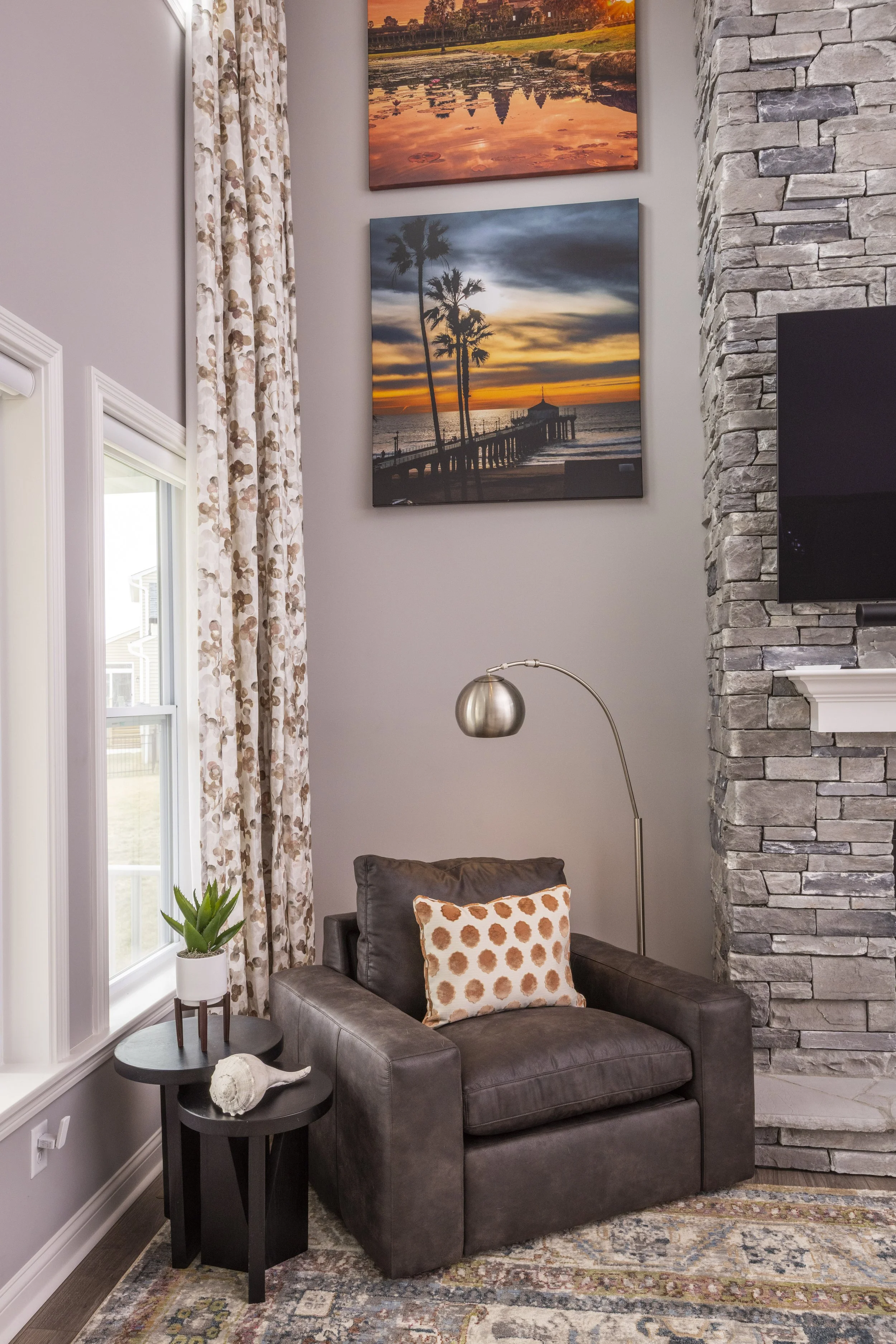 This client just moved to Cincinnati, Ohio from Cambodia for her government job. She wanted color and to be able to mix pieces she has collected over the years at various places she has lived. She loved the color palette that included plum, whites, greys, and browns. The end result was a space she can relax and enjoy after a long day at the office!