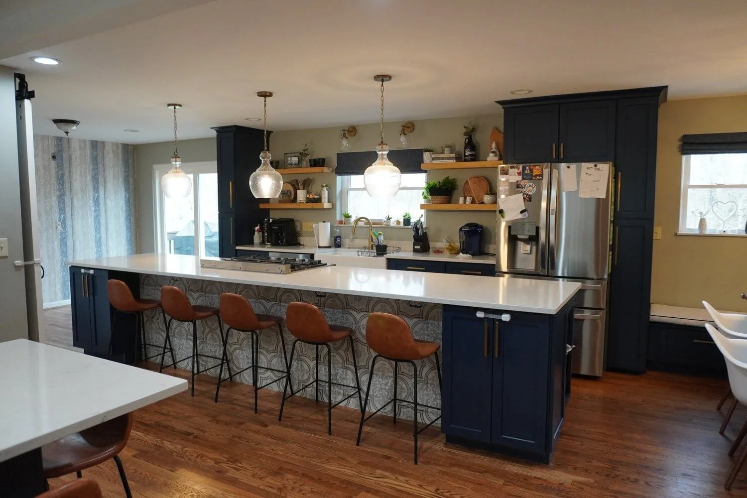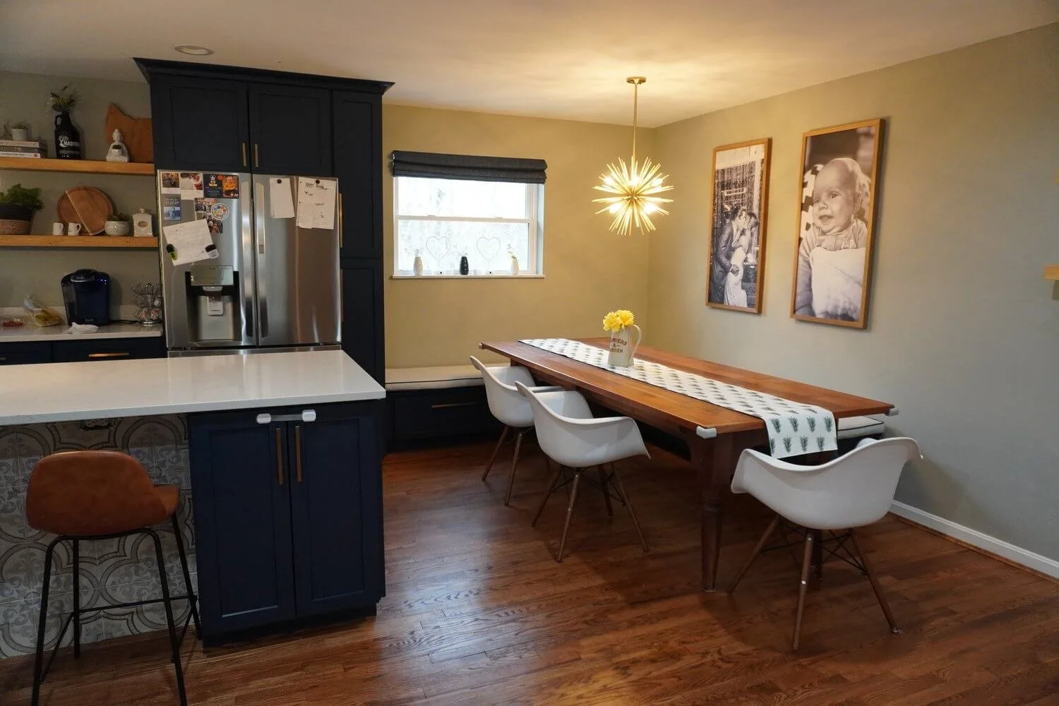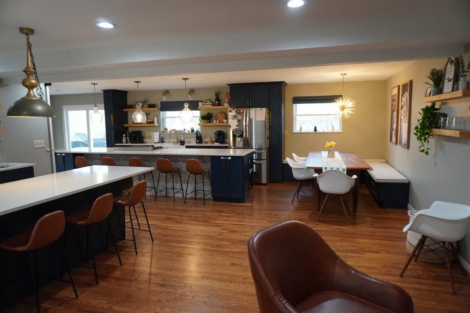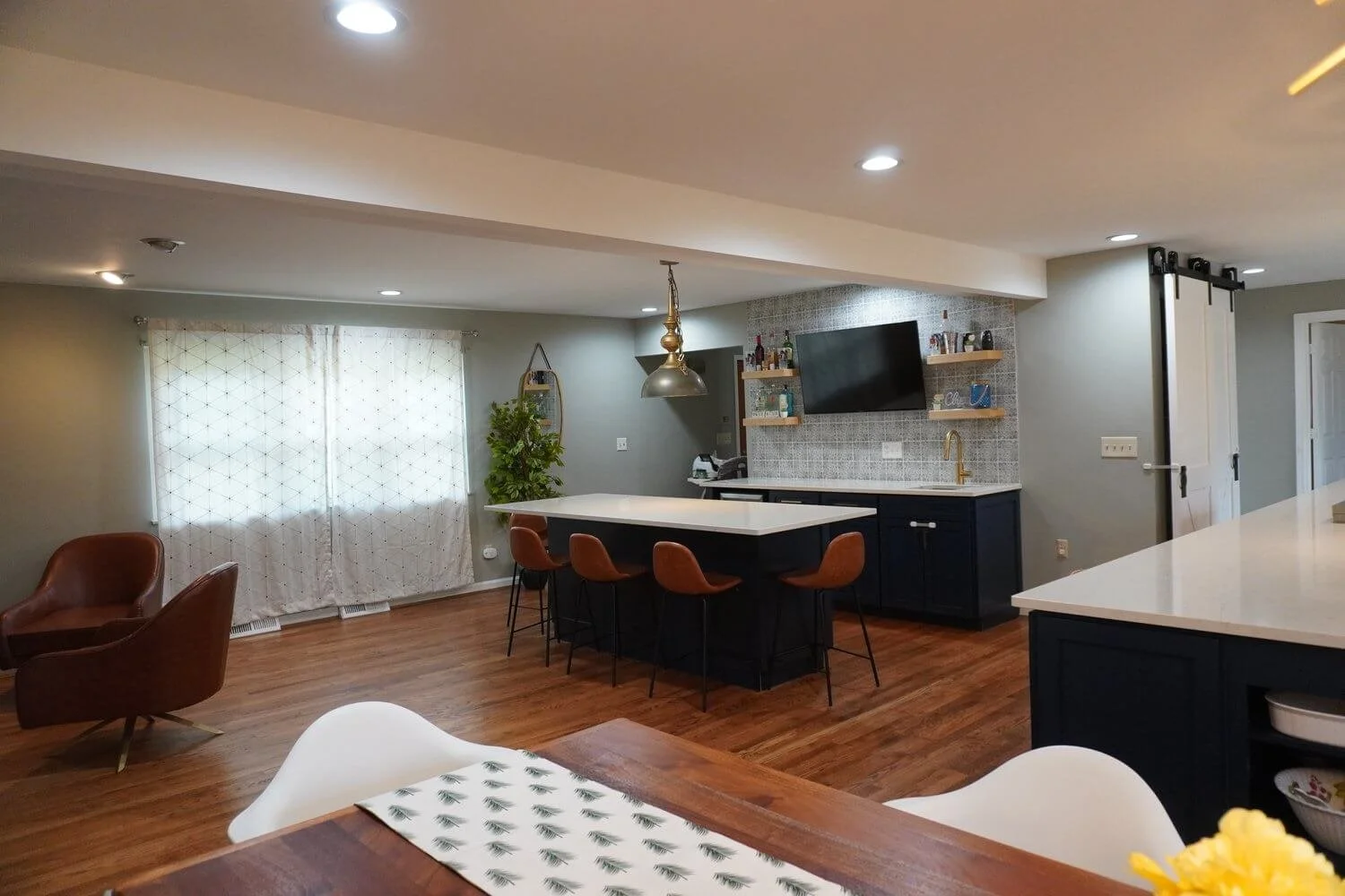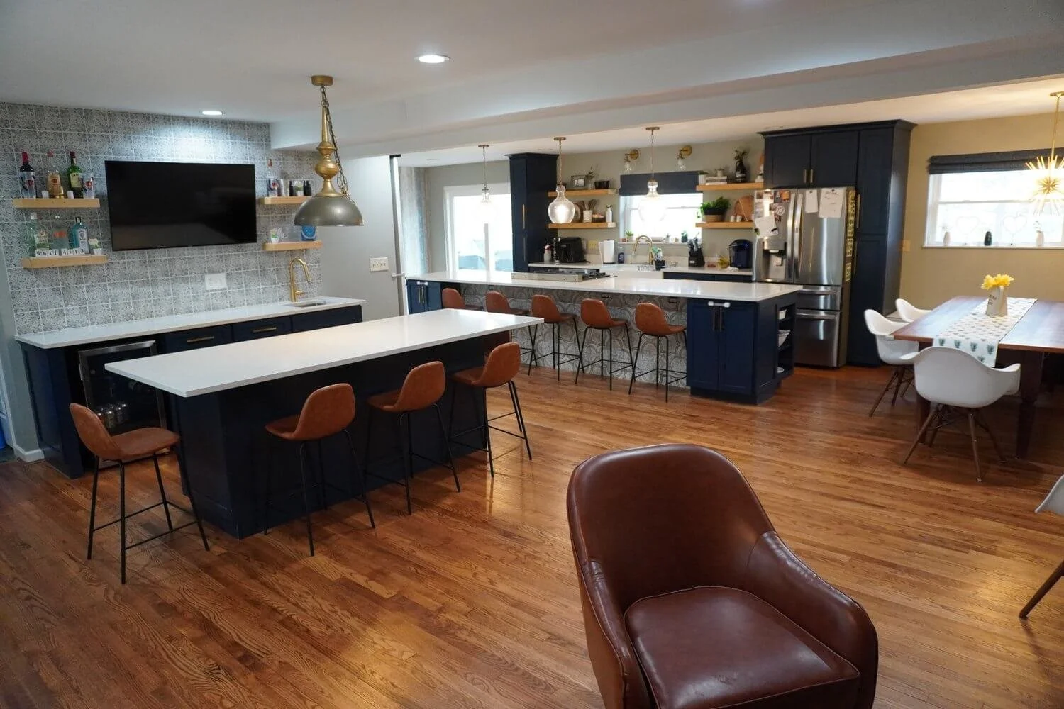 This young family with a baby on the way just moved into a home that they wanted to update and make the space functional for entertaining large groups. Removing a wall created an open space plan that served three different zones: Kitchen and Prep, Dining, and Socializing! Closing off one entrance to the back deck, and creating a window in its place created a great spot for bench seating and dining. Bar bar area with a fully stocked bar, fridge, and shelving across from extra seating is a perfect place for family and friends to gather for the game. All floors were refinished, blue cabinets were chosen to add some color, and touches of wood and gold were placed throughout the space to capture the fun spirit of this young couple and growing family.