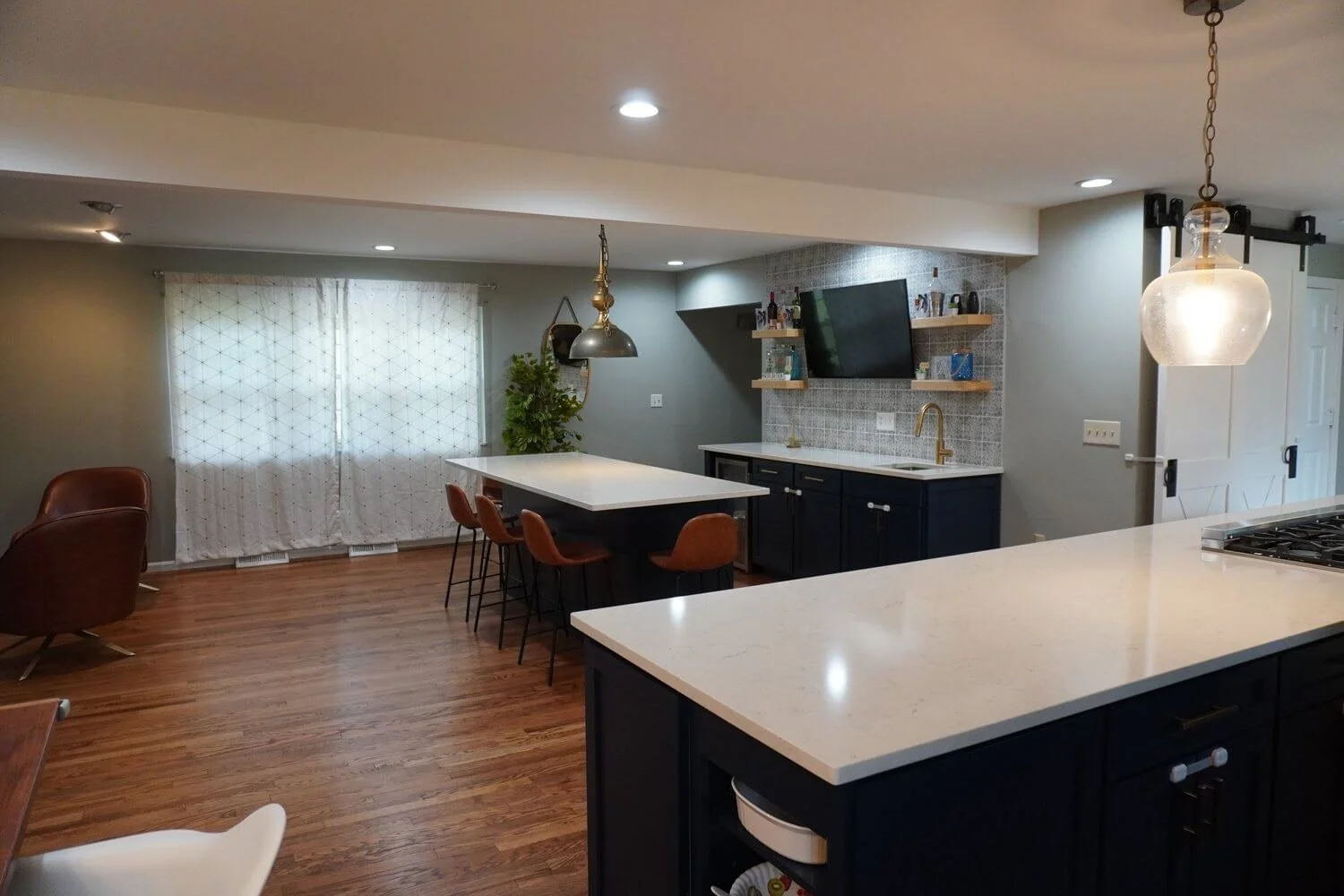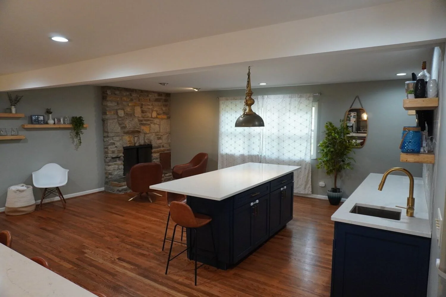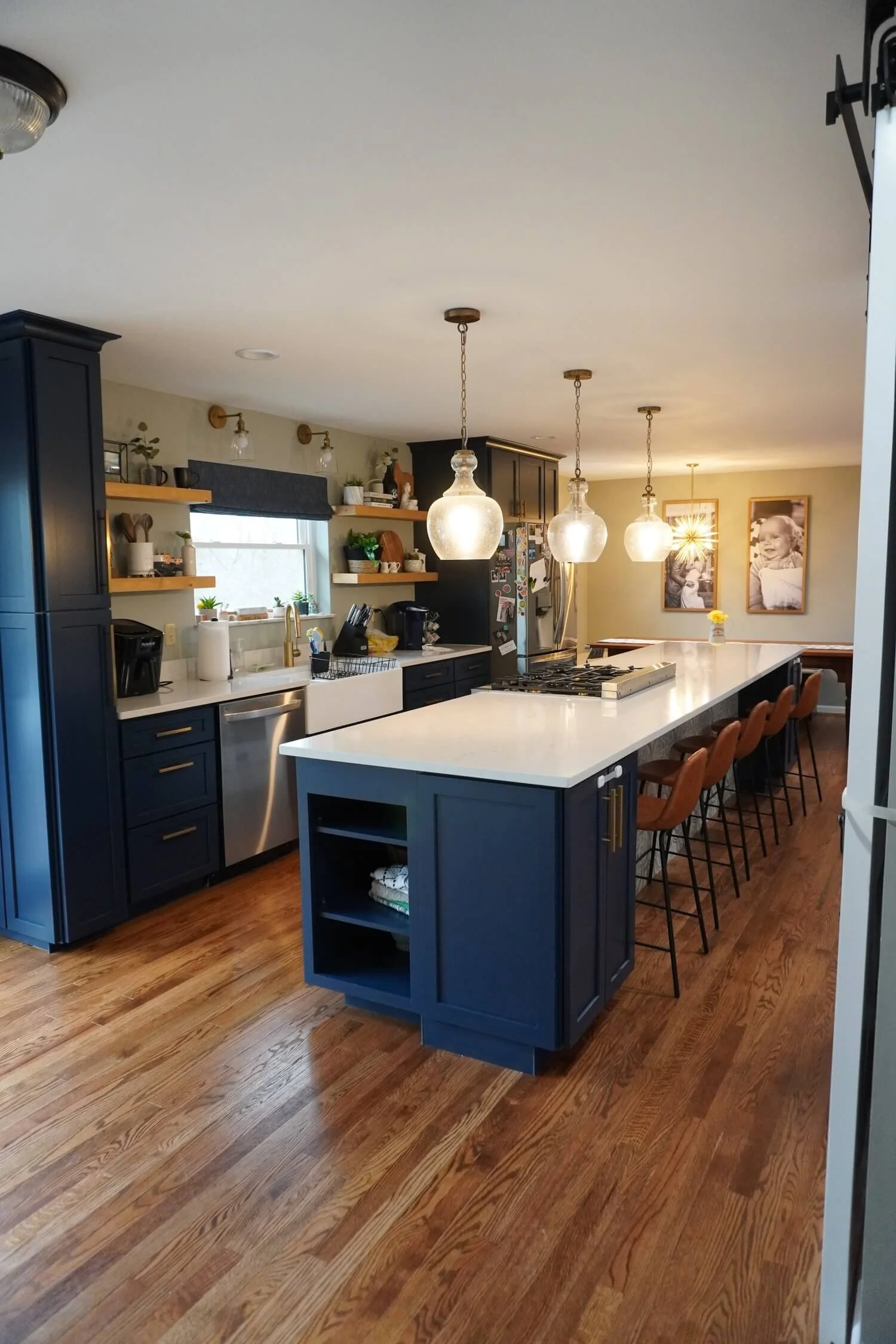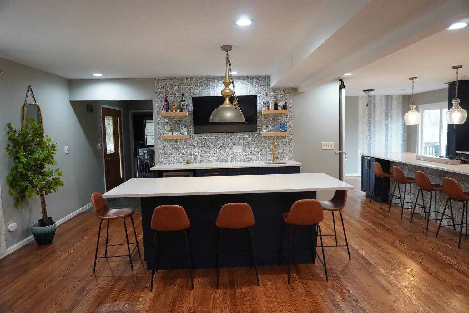 This young family with a baby on the way just moved into a home that they wanted to update and make the space functional for entertaining large groups. Removing a wall created an open space plan that served three different zones: Kitchen and Prep, Dining, and Socializing! Closing off one entrance to the back deck, and creating a window in its place created a great spot for bench seating and dining. Bar bar area with a fully stocked bar, fridge, and shelving across from extra seating is a perfect place for family and friends to gather for the game. All floors were refinished, blue cabinets were chosen to add some color, and touches of wood and gold were placed throughout the space to capture the fun spirit of this young couple and growing family.