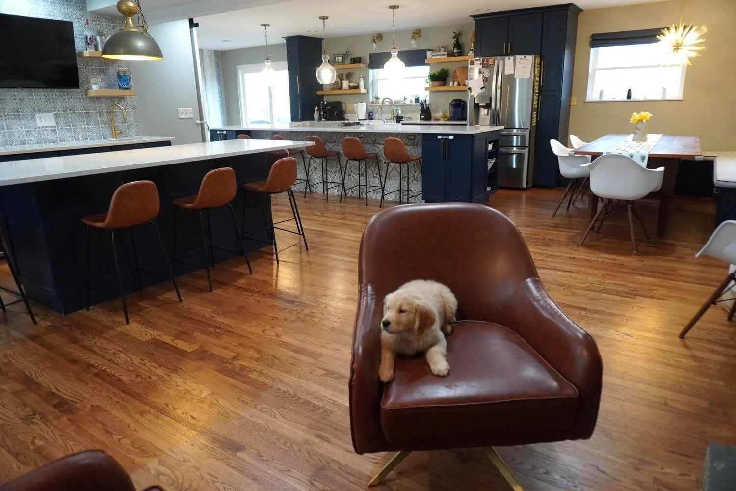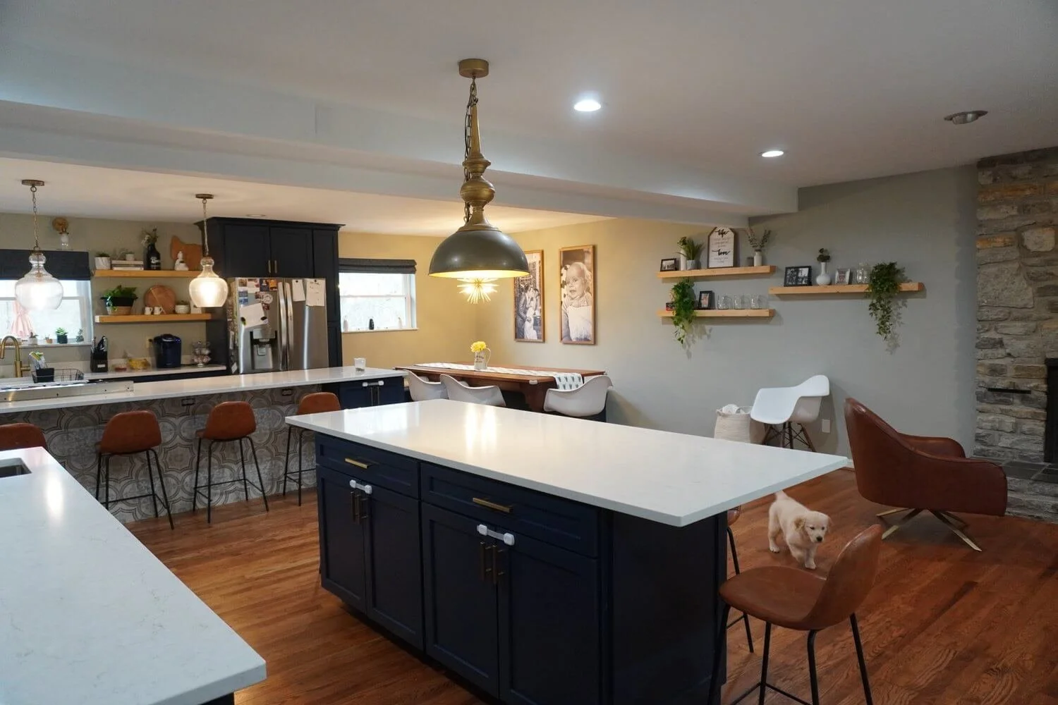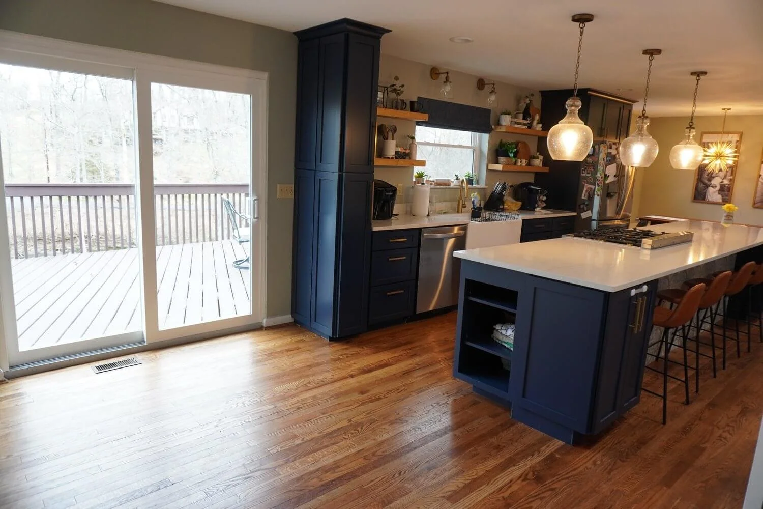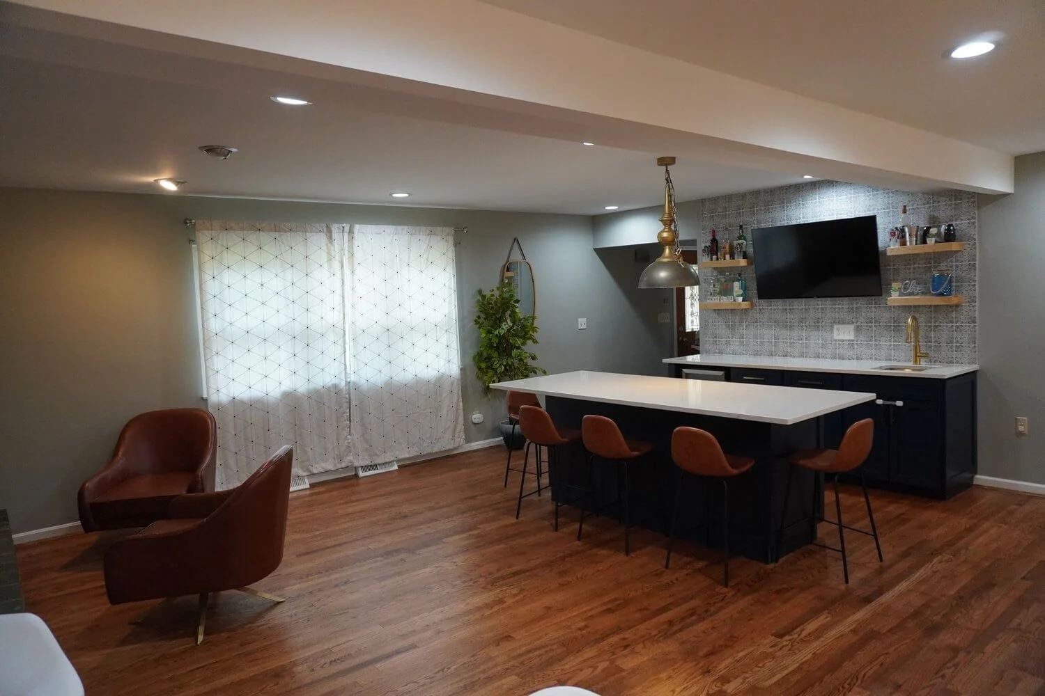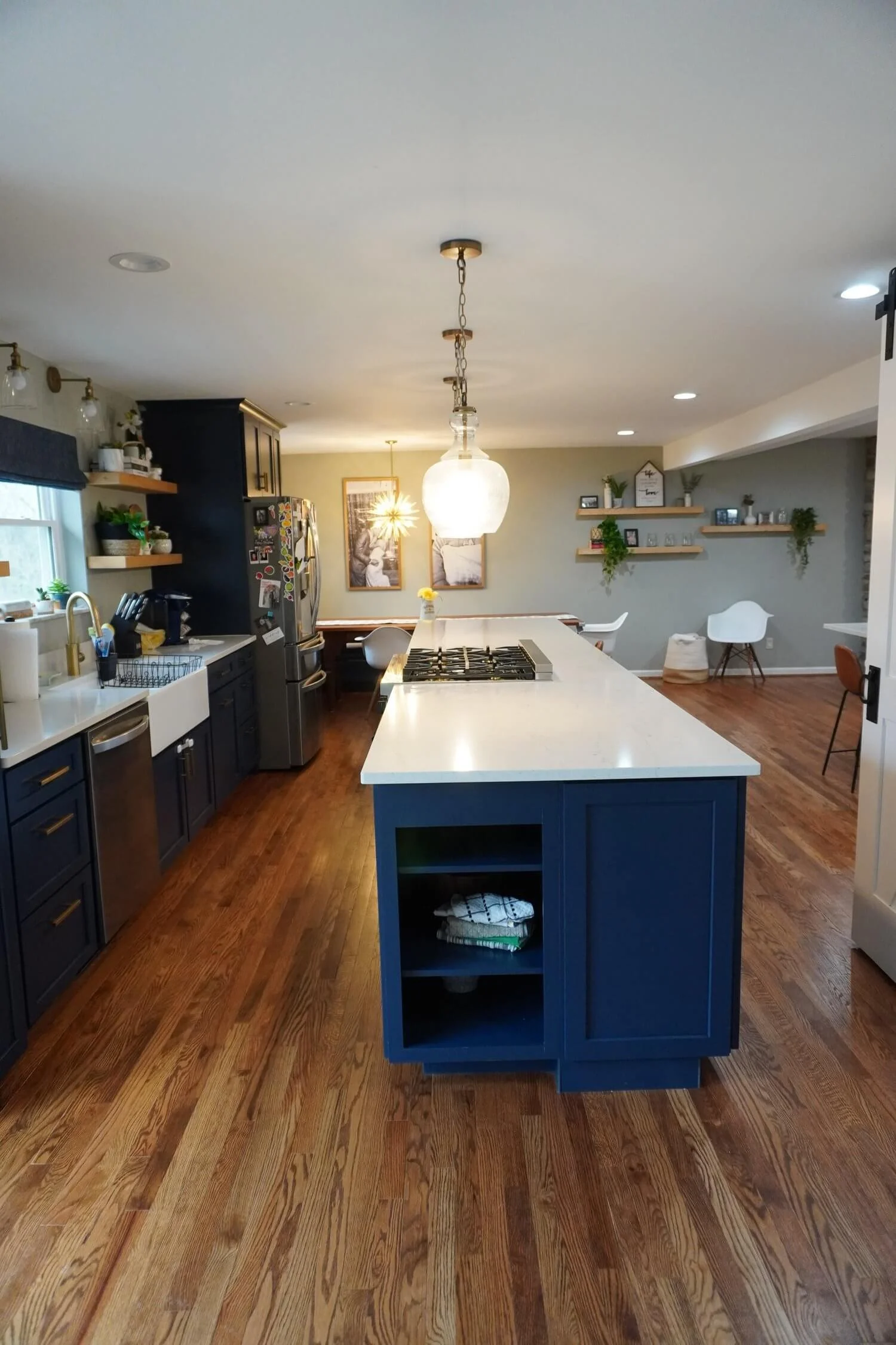 This young family with a baby on the way just moved into a home that they wanted to update and make the space functional for entertaining large groups. Removing a wall created an open space plan that served three different zones: Kitchen and Prep, Dining, and Socializing! Closing off one entrance to the back deck, and creating a window in its place created a great spot for bench seating and dining. Bar bar area with a fully stocked bar, fridge, and shelving across from extra seating is a perfect place for family and friends to gather for the game. All floors were refinished, blue cabinets were chosen to add some color, and touches of wood and gold were placed throughout the space to capture the fun spirit of this young couple and growing family.