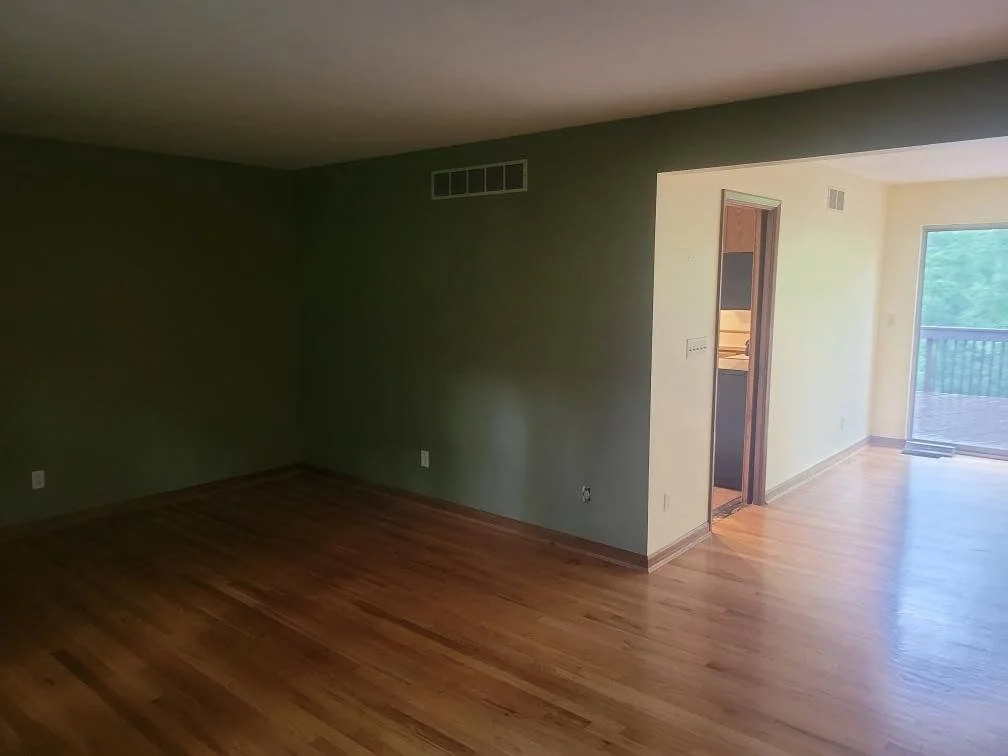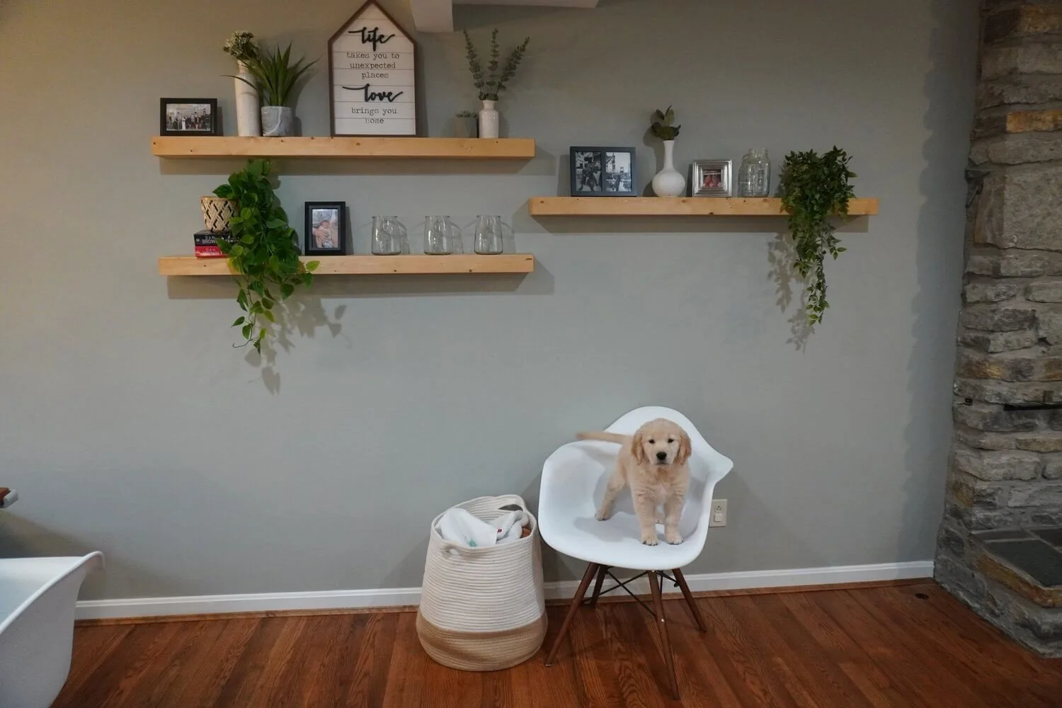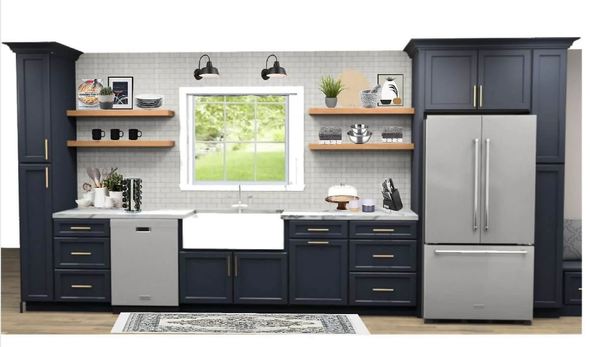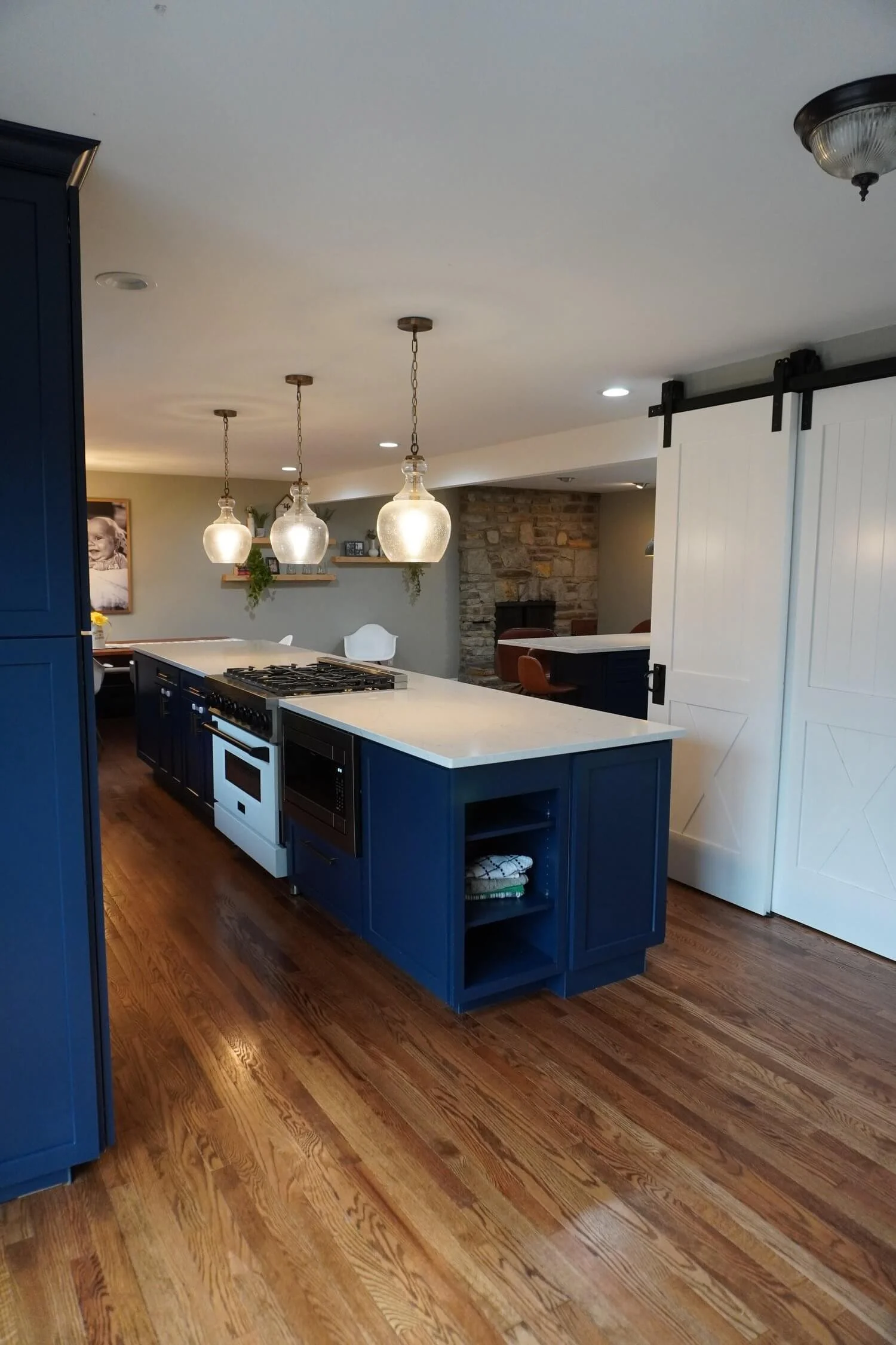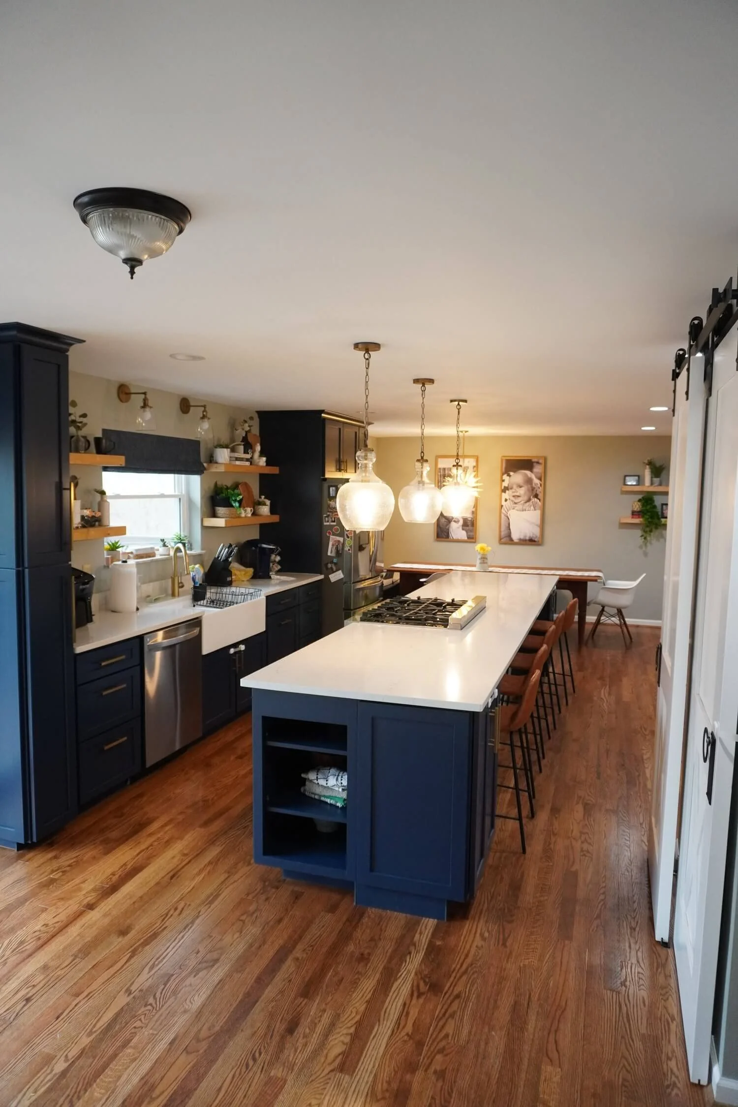 This young family with a baby on the way just moved into a home that they wanted to update and make the space functional for entertaining large groups. Removing a wall created an open space plan that served three different zones: Kitchen and Prep, Dining, and Socializing! Closing off one entrance to the back deck, and creating a window in its place created a great spot for bench seating and dining. Bar bar area with a fully stocked bar, fridge, and shelving across from extra seating is a perfect place for family and friends to gather for the game. All floors were refinished, blue cabinets were chosen to add some color, and touches of wood and gold were placed throughout the space to capture the fun spirit of this young couple and growing family.